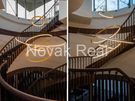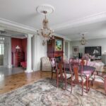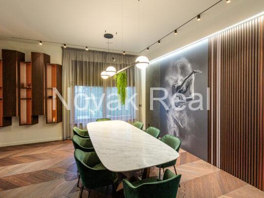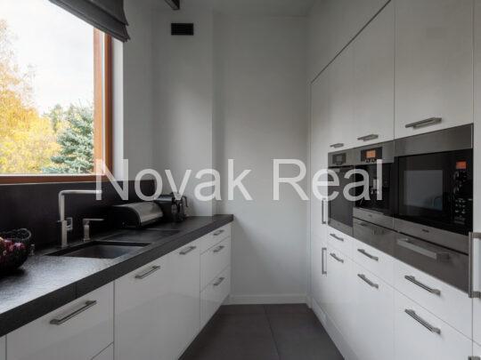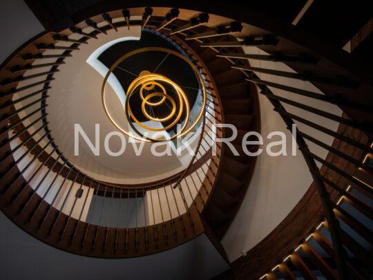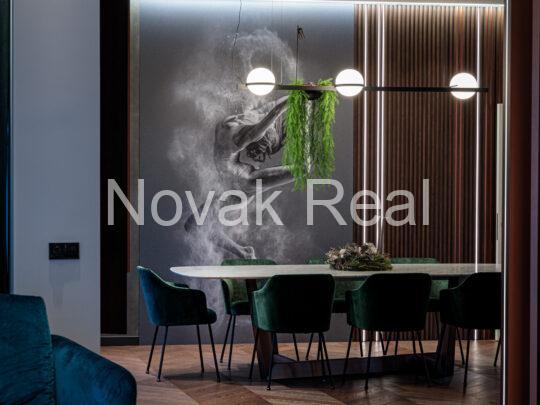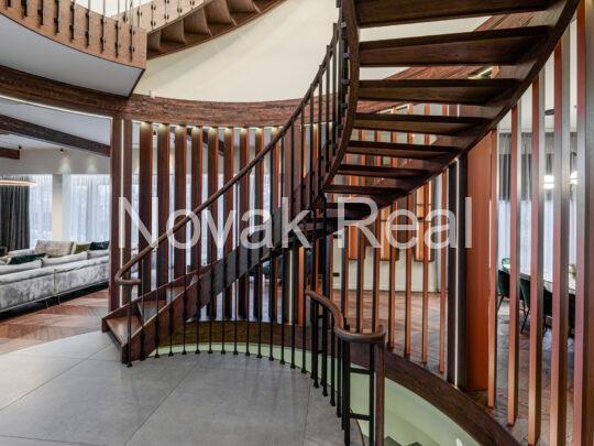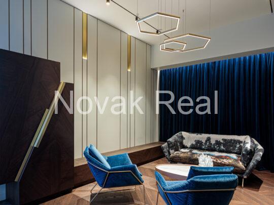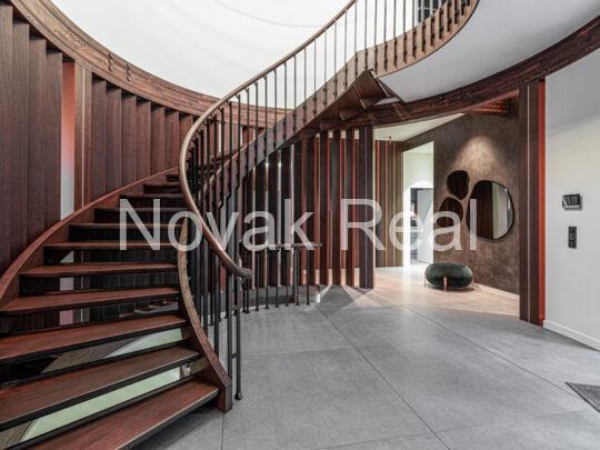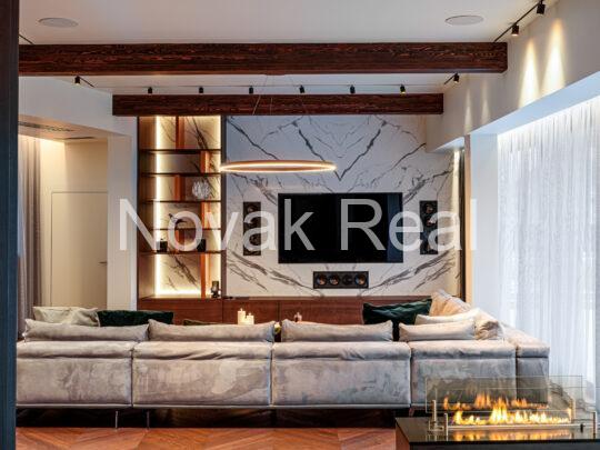 The renovation features premium finishes and meticulously selected architectural elements. The floors are covered with two-layer oak parquet in a warm walnut tone and Italian tiles. Accent wooden panels with integrated LED lighting, copper details, a designer staircase, and thoughtful light composition create a refined, expressive interior. Hidden doors, electric blinds, and smart lighting systems are installed throughout the home. The living room features a bio-fireplace and a Yamaha audio/video system. The kitchen, in soft white-grey tones, is equipped with Miele built-in appliances.