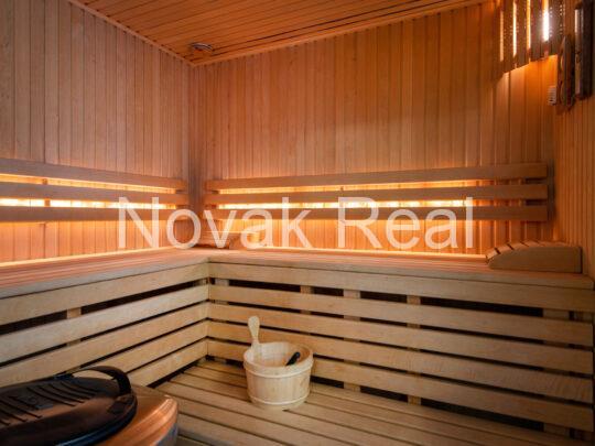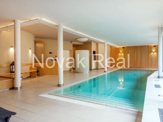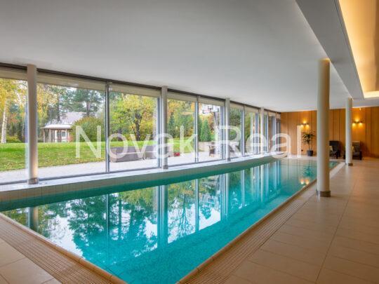 Basement level: leisure area with a swimming pool (2.10 m deep, 11 m long), sauna, jacuzzi and an additional bathroom. Storage rooms, laundry room, technical rooms/boiler room and a garage for four cars are located nearby.