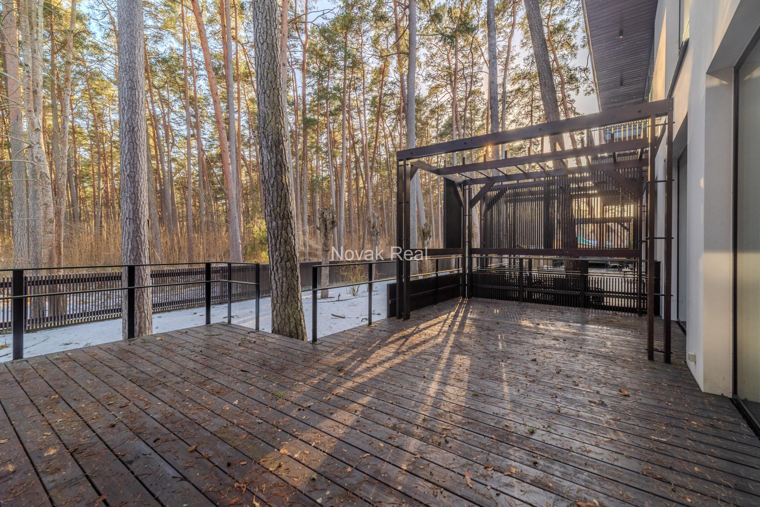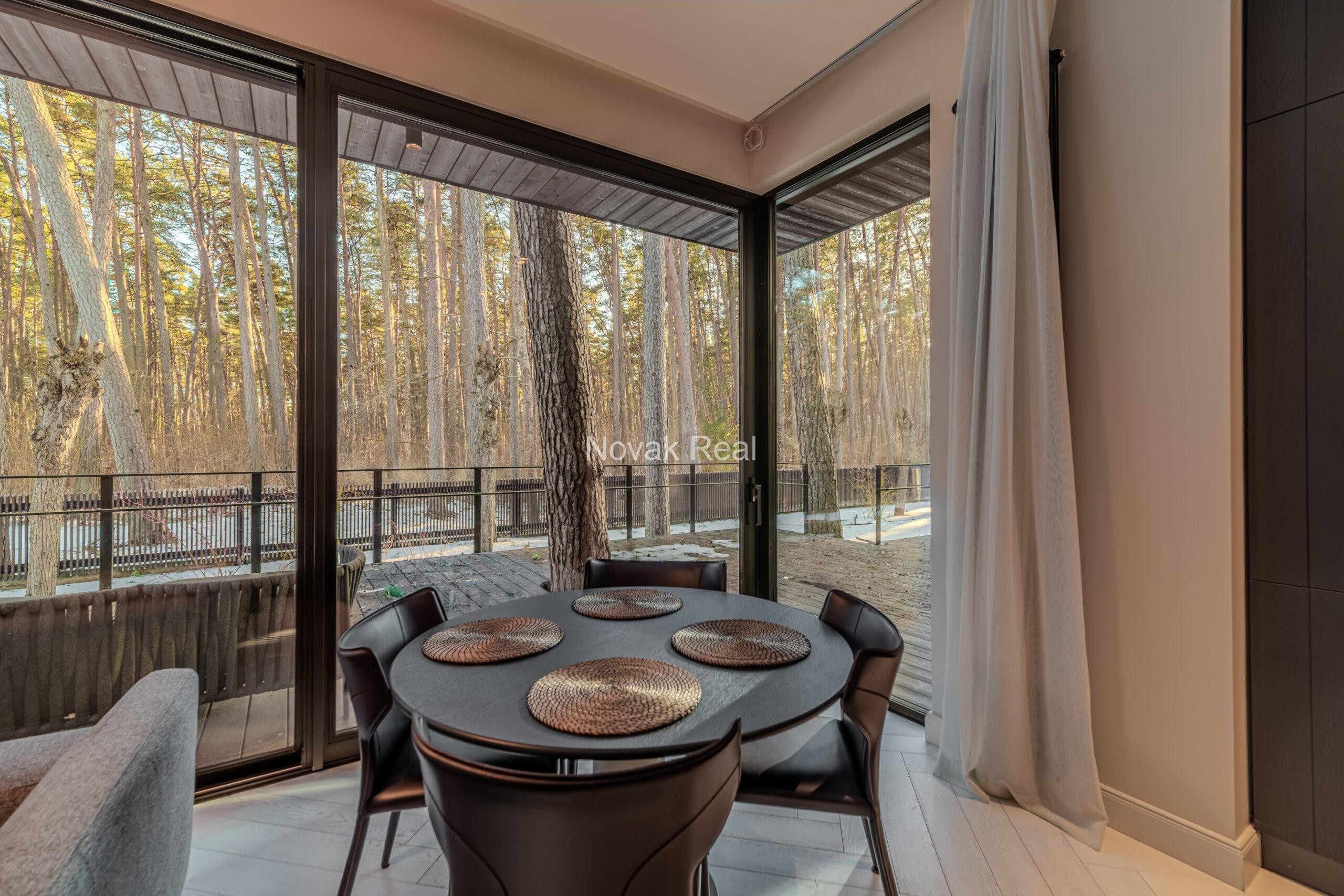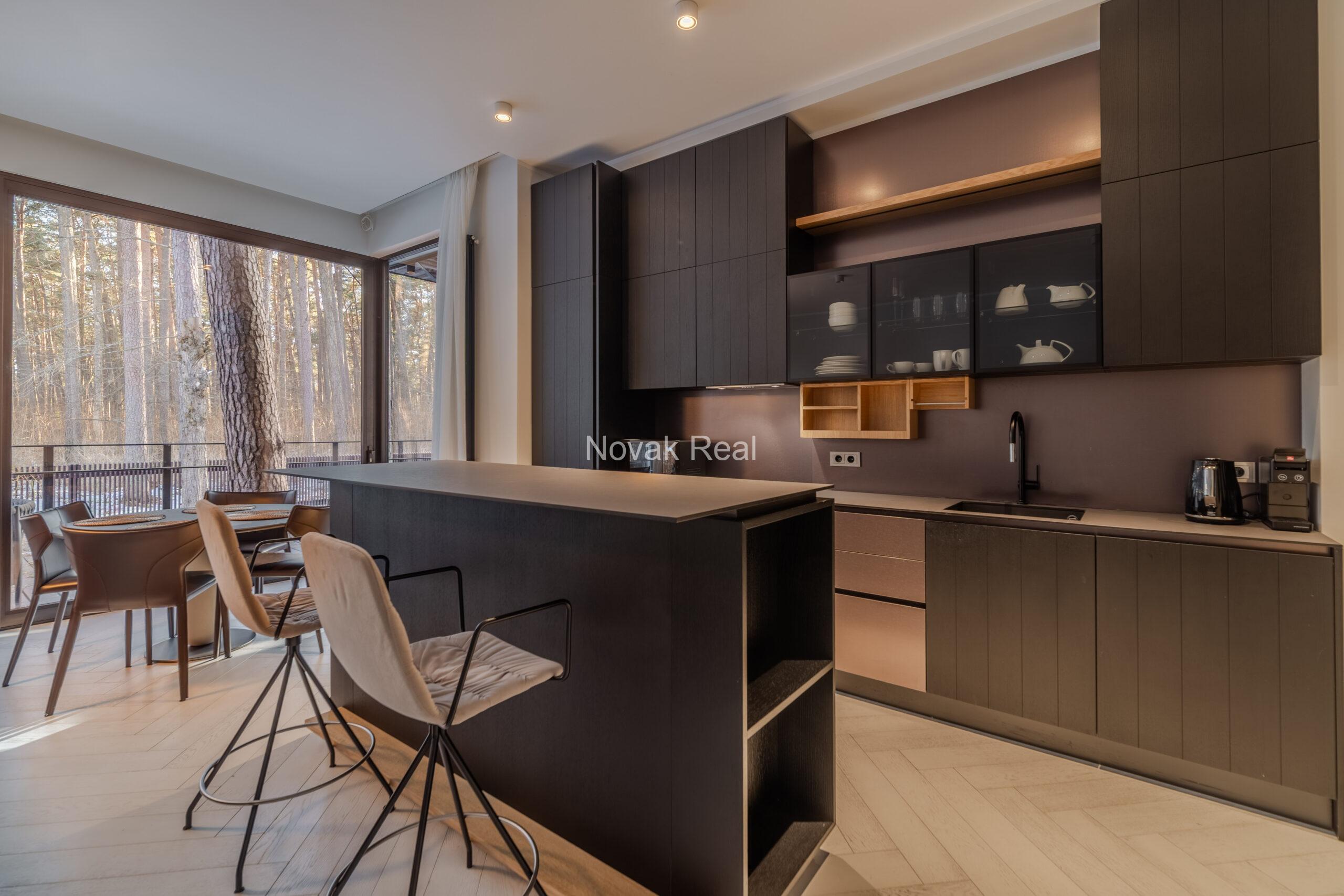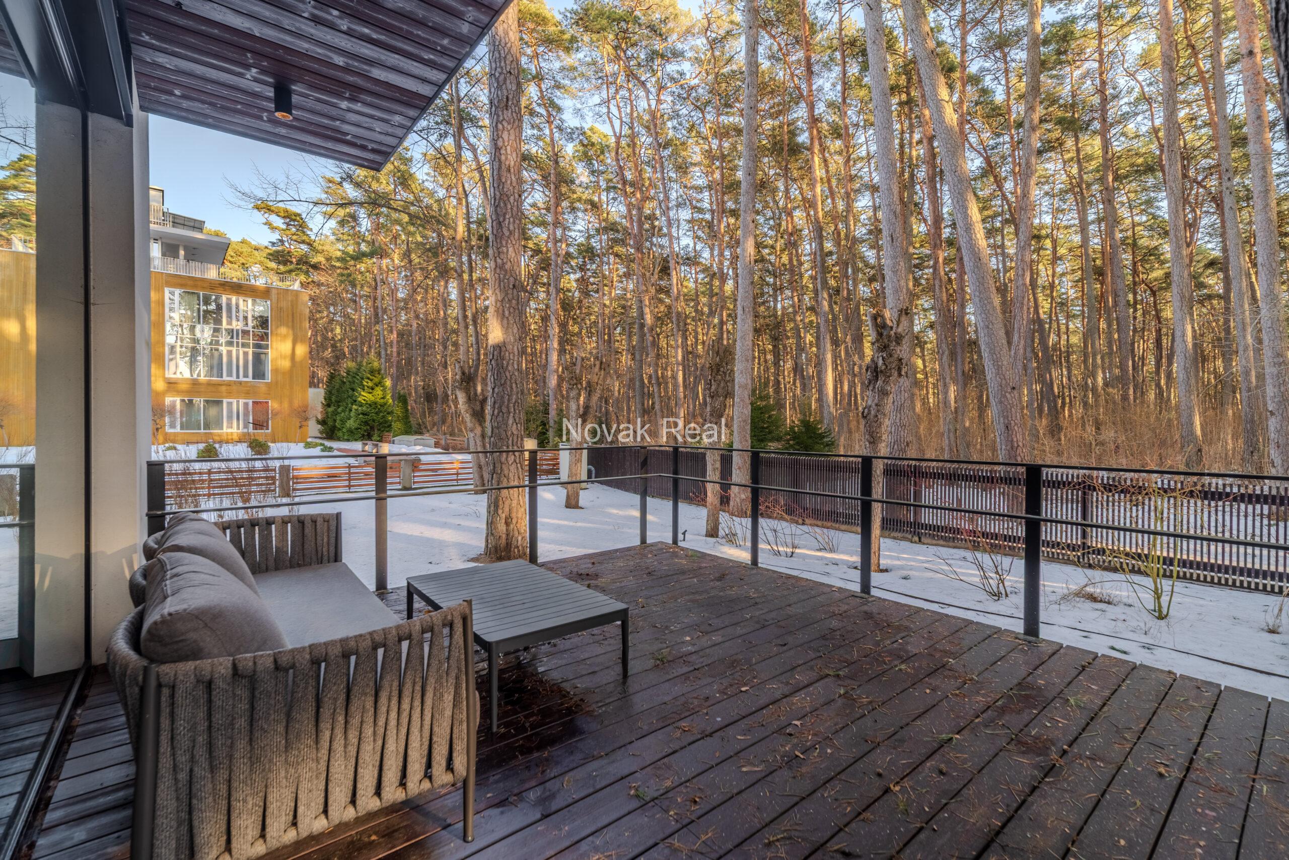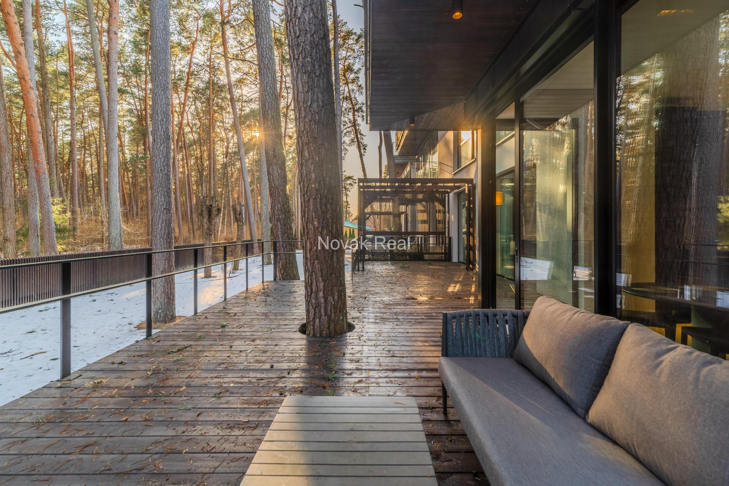 Dzīvoklī ir 2 guļamistabas, 2 sanitārie mezgli, saimniecības telpa un plaša viesistaba ar skaistu skatu uz priedēm. Griestu augstums — 5 metri.