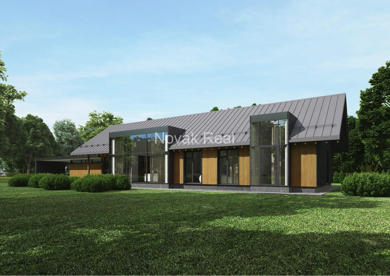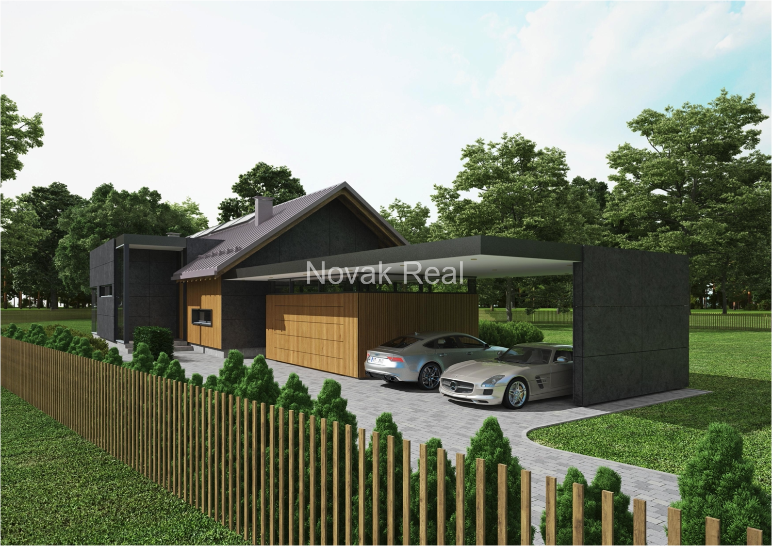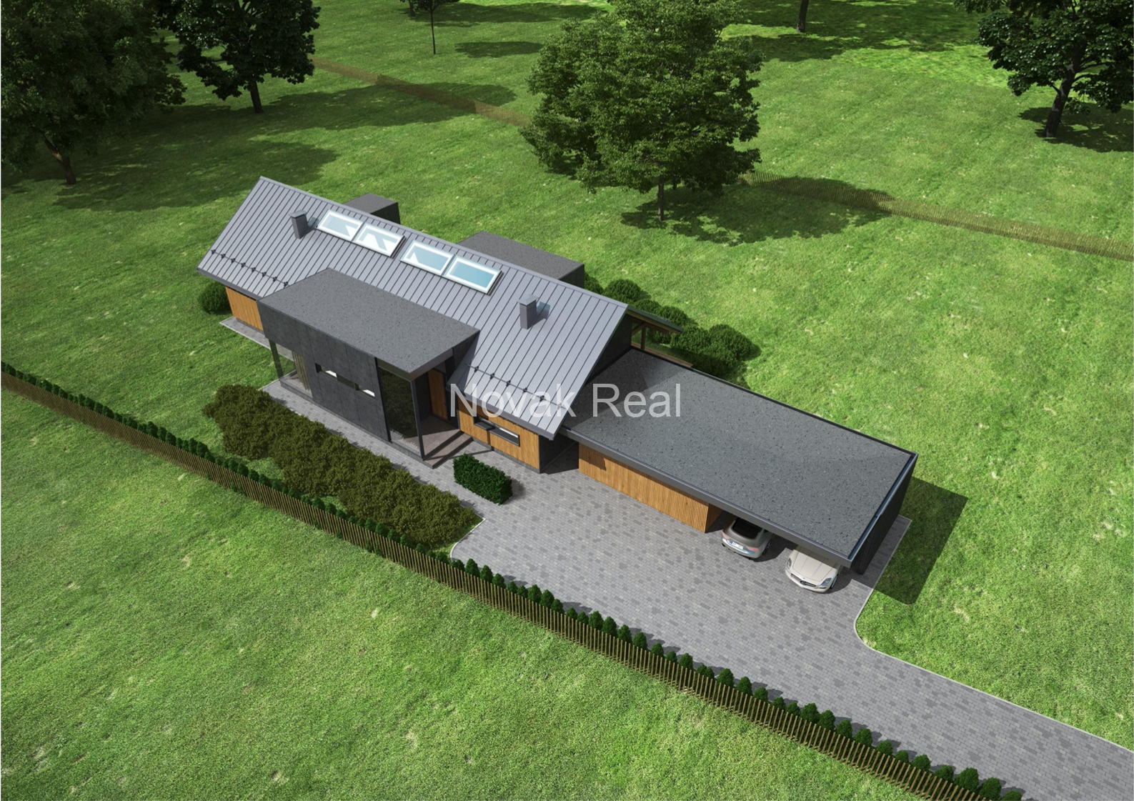 Cenā iekļauts gatavs mūsdienīgas mājas arhitektūras projekts ar būvatļauju (nepieciešams pagarināt). Projekts paredz izteiksmīgu arhitektūru ar panorāmas stiklojumu, otro gaismu viesistabā, pārdomātu privāto zonu un integrētu garāžu. Tīras līnijas, koka un tumšo fasādes apjomu kombinācija, lakoniska ģeometrija – māja organiski iekļaujas dabiskajā vidē.